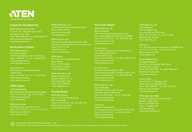 E-mail: sales@aten-usa.com Phone: +7-495-134-2808 E-mail: sales@aten.com.cn 6F., No.133, Sec. 2, Datung Rd., Sijhih District,