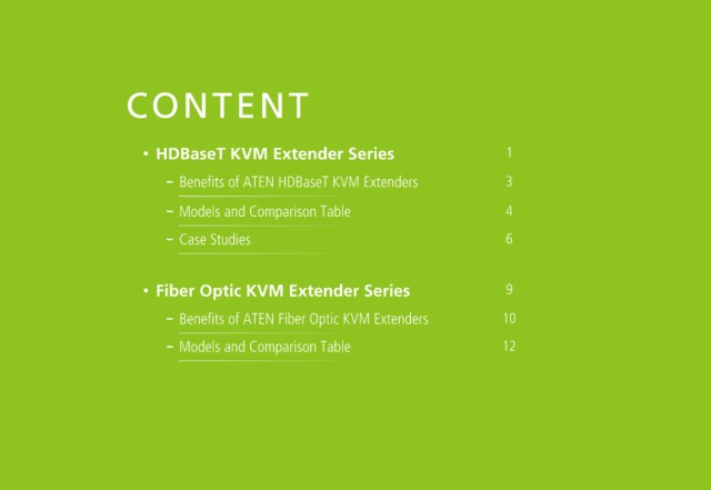 CONTENT HDBaseT KVM Extender Series 1 Benefits of ATEN HDBaseT KVM Extenders 3 Models and Comparison Table 4 Case Studies 6 Fiber Optic KVM Extender Series 9 Benefits of ATEN Fiber Optic KVM Extenders 10 Models and Comparison Table 12
