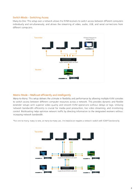 Many-to-One: This setup over a network allows the KVM receivers to switch access between different computers