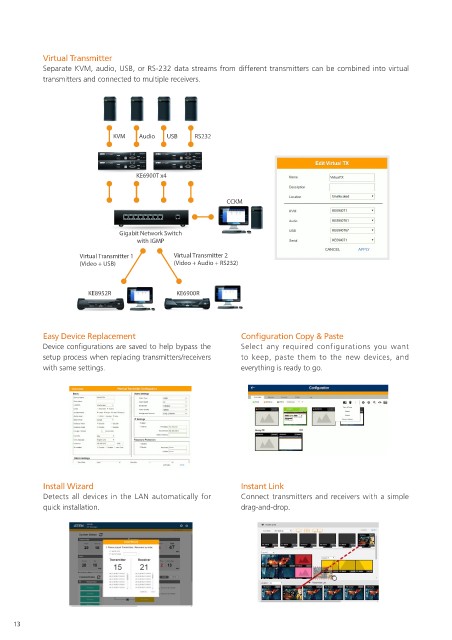 Separate KVM, audio, USB, or RS-232 data streams from different transmitters can be combined into virtual