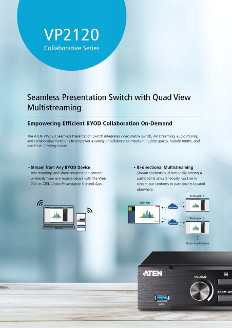 GUI or ATEN Video Presentation Control App. stream-out contents to participants located of sources, and select any source to enlarge to ensure the required level of IT security.