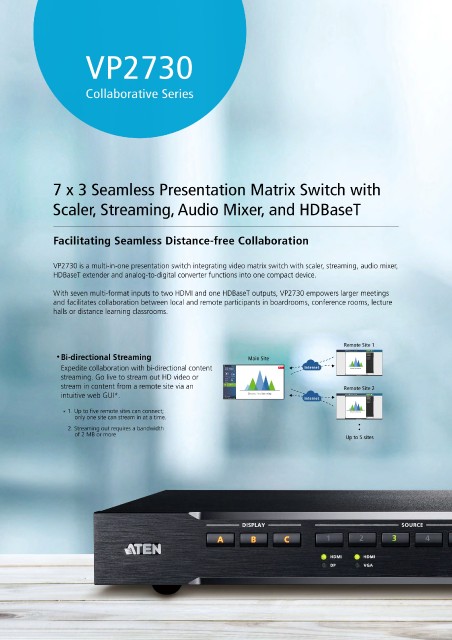 With seven multi-format inputs to two HDMI and one HDBaseT outputs, VP2730 empowers larger meetings