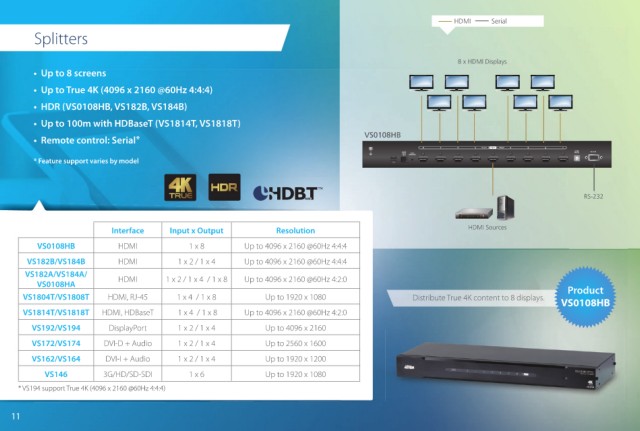 VS1814T/VS1818T HDMI, HDBaseT 1 x 4 / 1 x 8 Up to 4096 x 2160 @60Hz 4:2:0