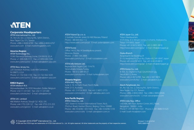 www.aten.com/eu/en/ E-mail: sales@aten.be www.aten.com/au/en/ E-mail: sales@au.aten.com Phone: +886-2-8692-6969 Fax: +886-2-8692-6926